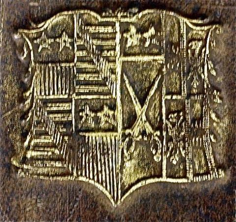 Dimensions: Arms Quarterly of six 1. An eagle displayed (Cotton) 2. A fess dancetty between three mullets (Wesenham) 3. A saltire and chief (Bruce) 4. Three piles in point on an inescutcheon a lion rampant within a double tressure flory counterflory (David, Earl of Huntingdon) 5. A lion rampant and a chief (Waltheof, Earl of Huntingdon) 6. A cross flory between four martlets (Edward the Confessor)