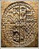 Dimensions: Arms Quarterly of eight 1. A chevron ermines between three mullets pierced (Gresham) 2. A chevron between three lions rampant (Blythe) 3. A crescent between two mullets in pale (Jermyn) 4. A fess dancetty ermine between six falcons heads erased (Ipswell) 5. Ten billets four, three, two and one out of a chief a demi lion (Dormer) 6. Three fleurs de lys (Collingridge) 7. A lion rampant (Albaney) 8. Checky (Warrene)