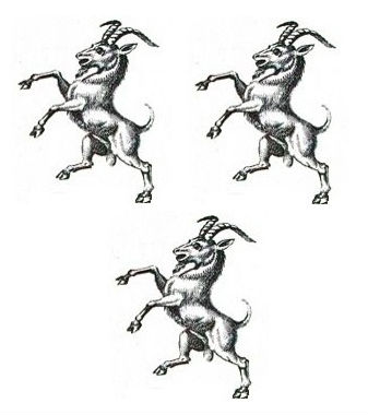 Arms Sable three goats trippant Crest A demi-lion rampant Helmet of an esquire Motto NOSCE TEIPSUM