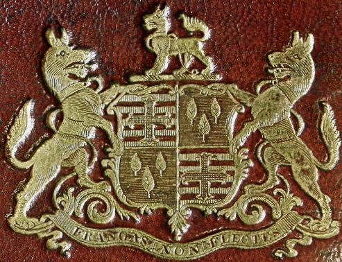 Crest: A wolf passant collared and lined Quarterly 1 & 4. Barry of eight argent and gules a cross flory sable (Gower) 2 & 3. Azure three laurel leaves (Leveson)
