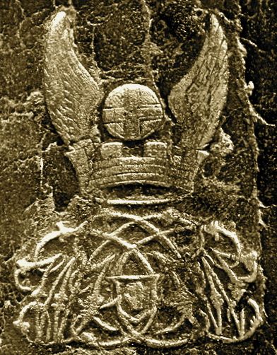 Crest: On a mural coronet a pomeis [roundel] charged with a cross or between two wings displayed ermine