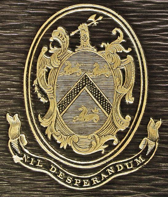 Crest: A lion’s gamb erased gules charged with four bezants holding a battleaxe in bend Azure a chevron or between three sea-horses argent